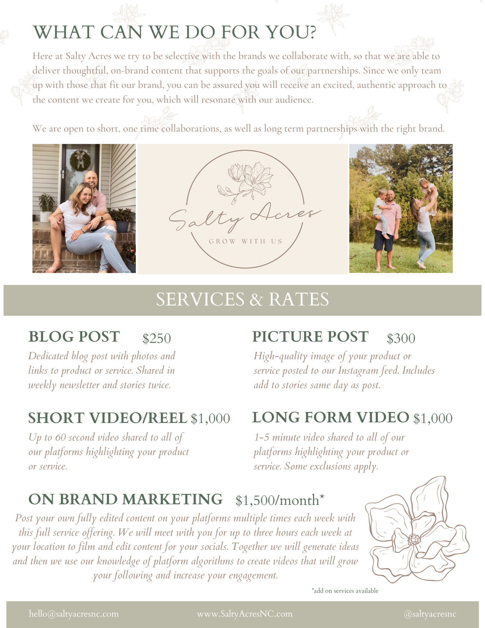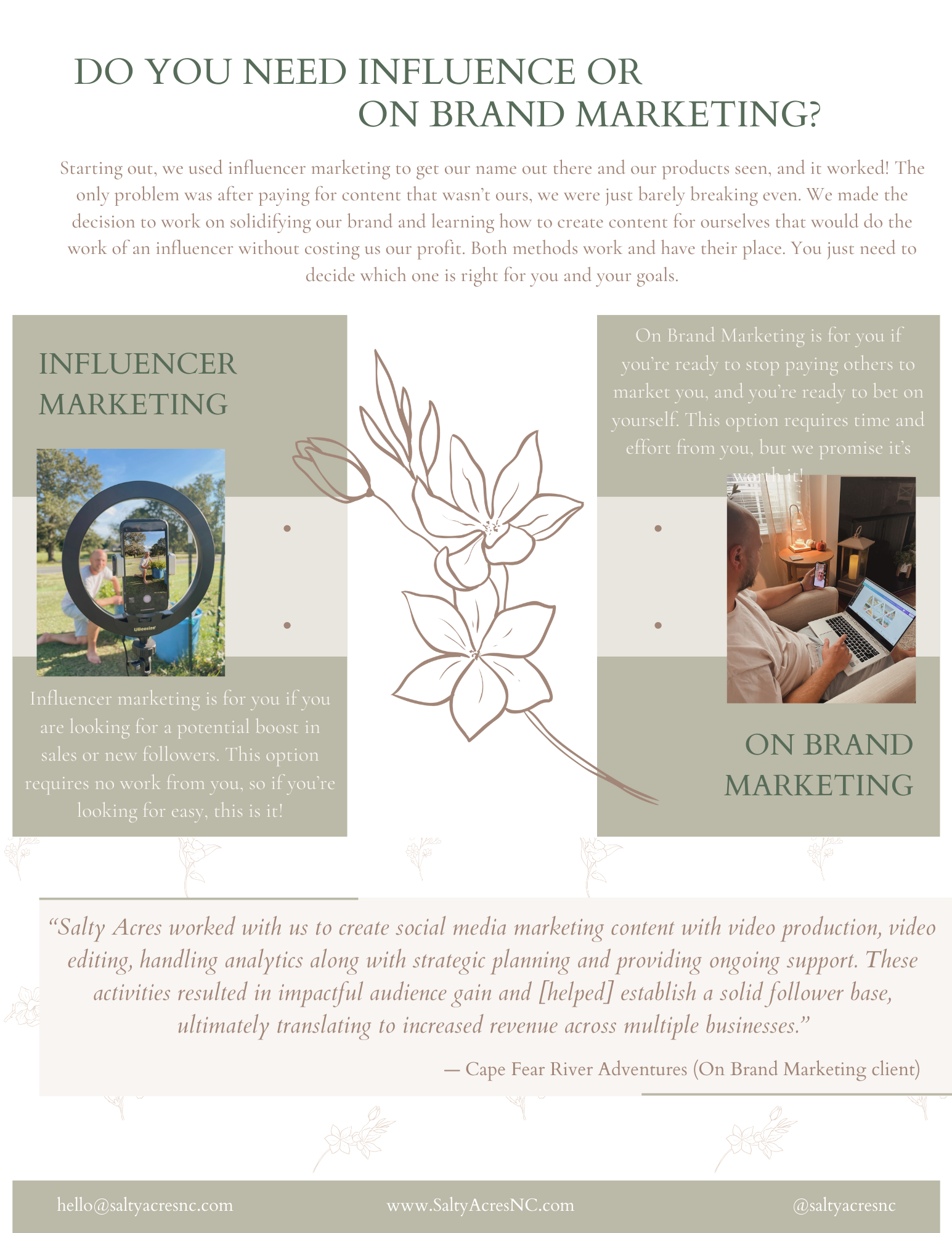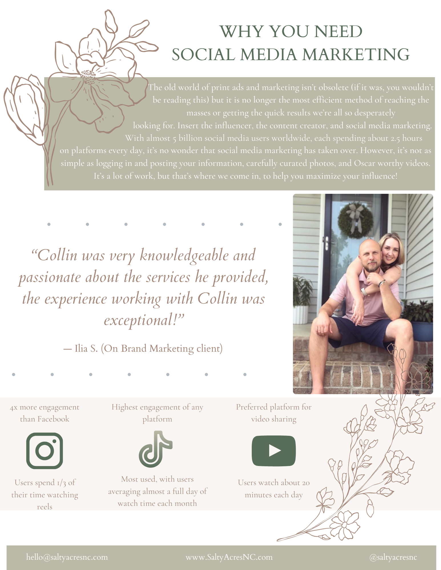 An infographic about the importance of social media marketing featuring a large flower illustration in the top left corner, a text box discussing the shift from print ads to social media, a testimonial quote from a client, a photo of a woman and a ma